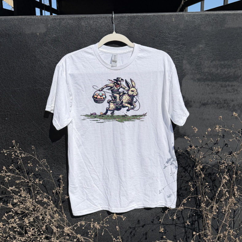 Experience the ultimate adventure with our Cowboy Bunny Shirt! Featuring a cowboy riding a bunny with a basket of eggs, this Easter design will transport you to a fun-filled holiday. Get ready to turn heads and spread joy wherever you go. Grab yours now!