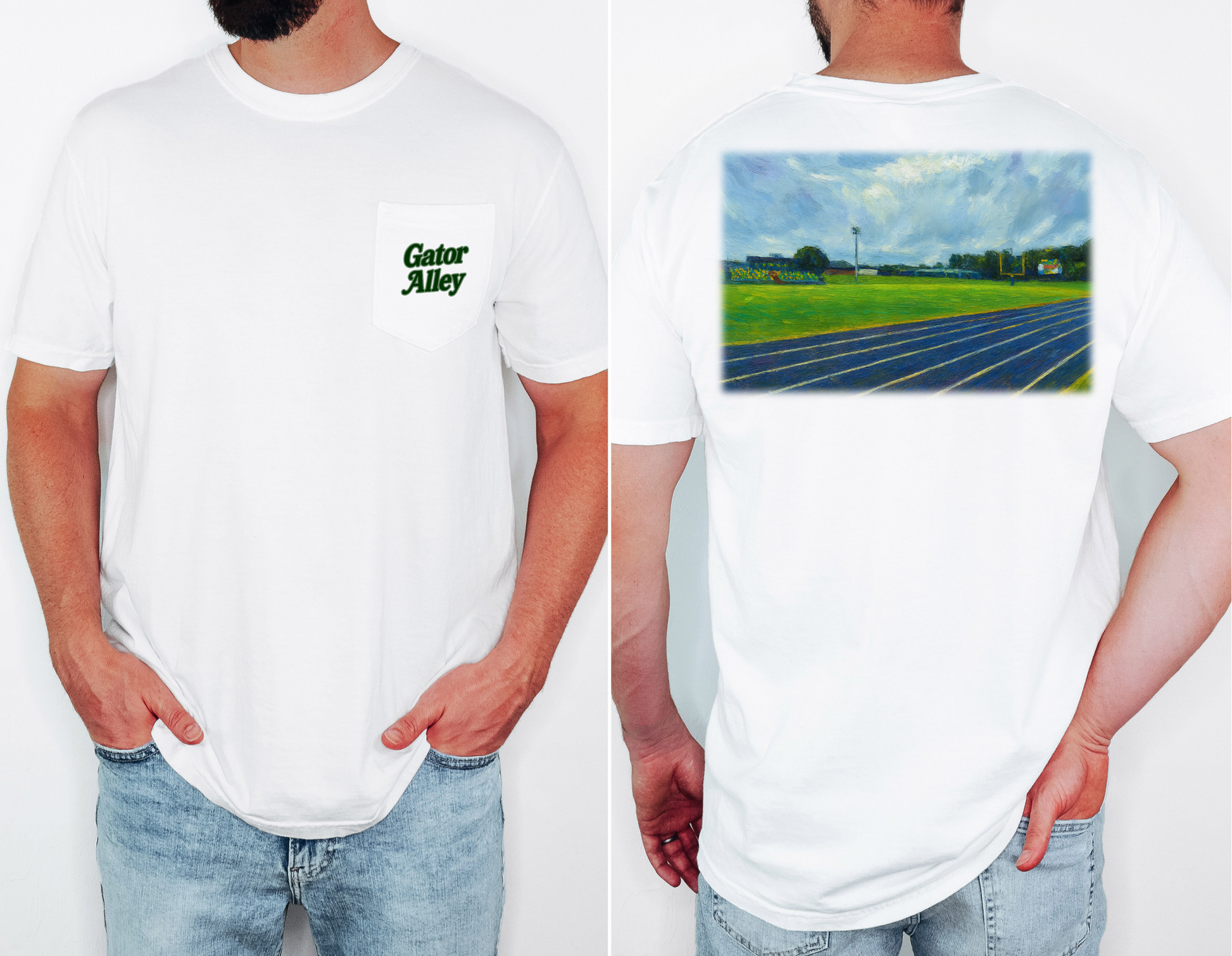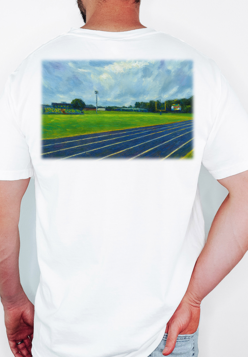 Celebrate local pride with the Football Stadium Pocket T-Shirt featuring a custom Bulloch Academy design. This unique shirt showcases a beautifully detailed watercolor painting of the stadium right on the back, combining art with hometown spirit. Crafted for comfort and style, it’s perfect for game days or casual wear, letting you carry your team's energy wherever you go. Show your support in a fresh, artistic way with this exclusive local design.
