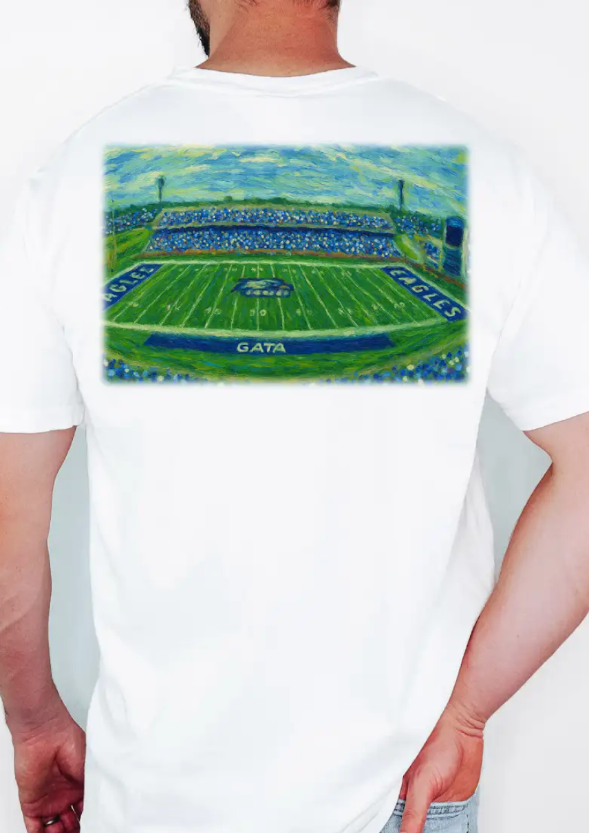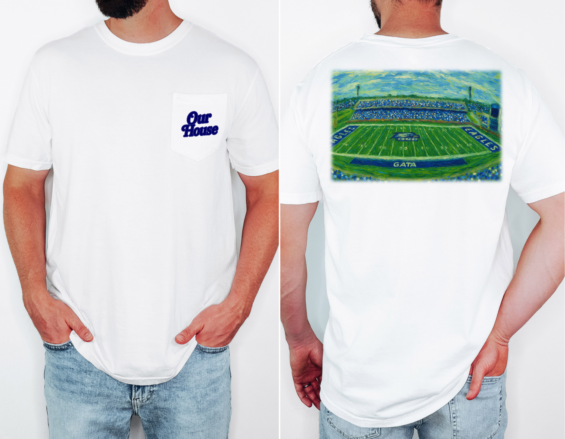 Celebrate local pride with the Football Stadium Pocket T-Shirt featuring a custom Georgia Southern design. This unique shirt showcases a beautifully detailed watercolor painting of the stadium right on the back, combining art with hometown spirit. Crafted for comfort and style, it’s perfect for game days or casual wear, letting you carry your team's energy wherever you go. Show your support in a fresh, artistic way with this exclusive local design.