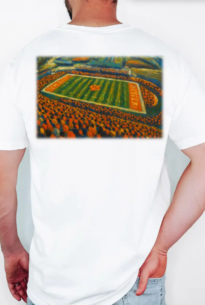 Celebrate local pride with the Football Stadium Pocket T-Shirt featuring a custom Metter High design. This unique shirt showcases a beautifully detailed watercolor painting of the stadium right on the back, combining art with hometown spirit. Crafted for comfort and style, it’s perfect for game days or casual wear, letting you carry your team's energy wherever you go. Show your support in a fresh, artistic way with this exclusive local design.