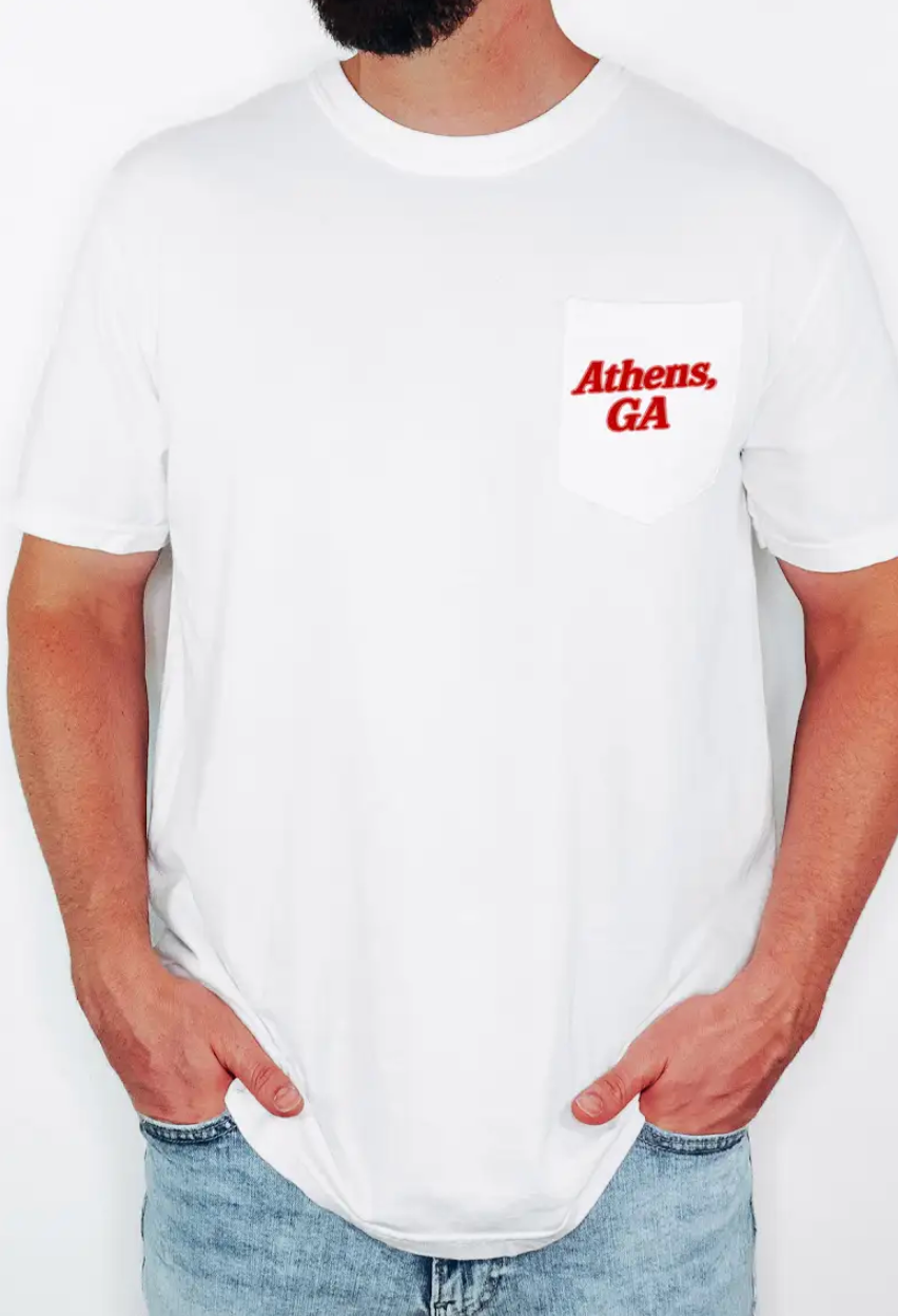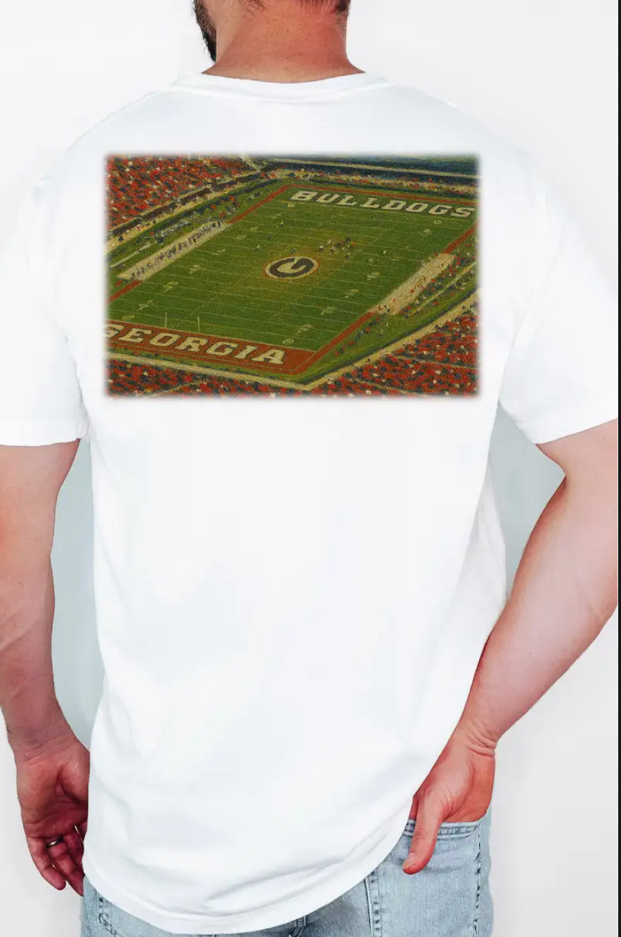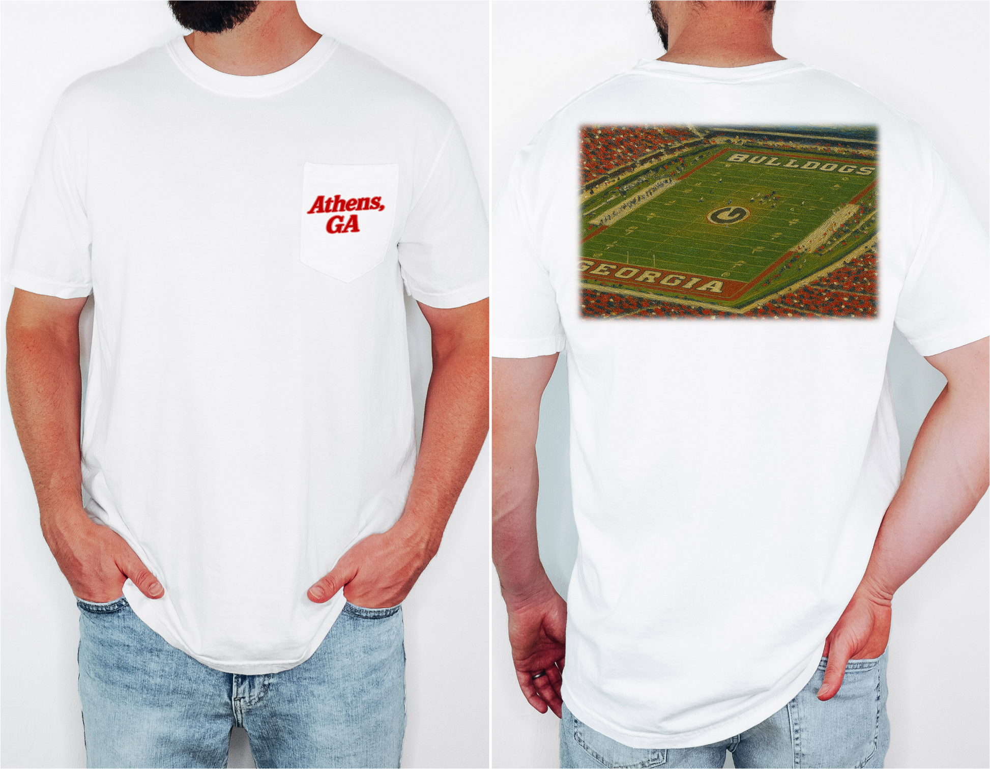 Celebrate local pride with the Football Stadium Pocket T-Shirt featuring a custom UGA design. This unique shirt showcases a beautifully detailed watercolor painting of the stadium right on the back, combining art with hometown spirit. Crafted for comfort and style, it’s perfect for game days or casual wear, letting you carry your team's energy wherever you go. Show your support in a fresh, artistic way with this exclusive local design.