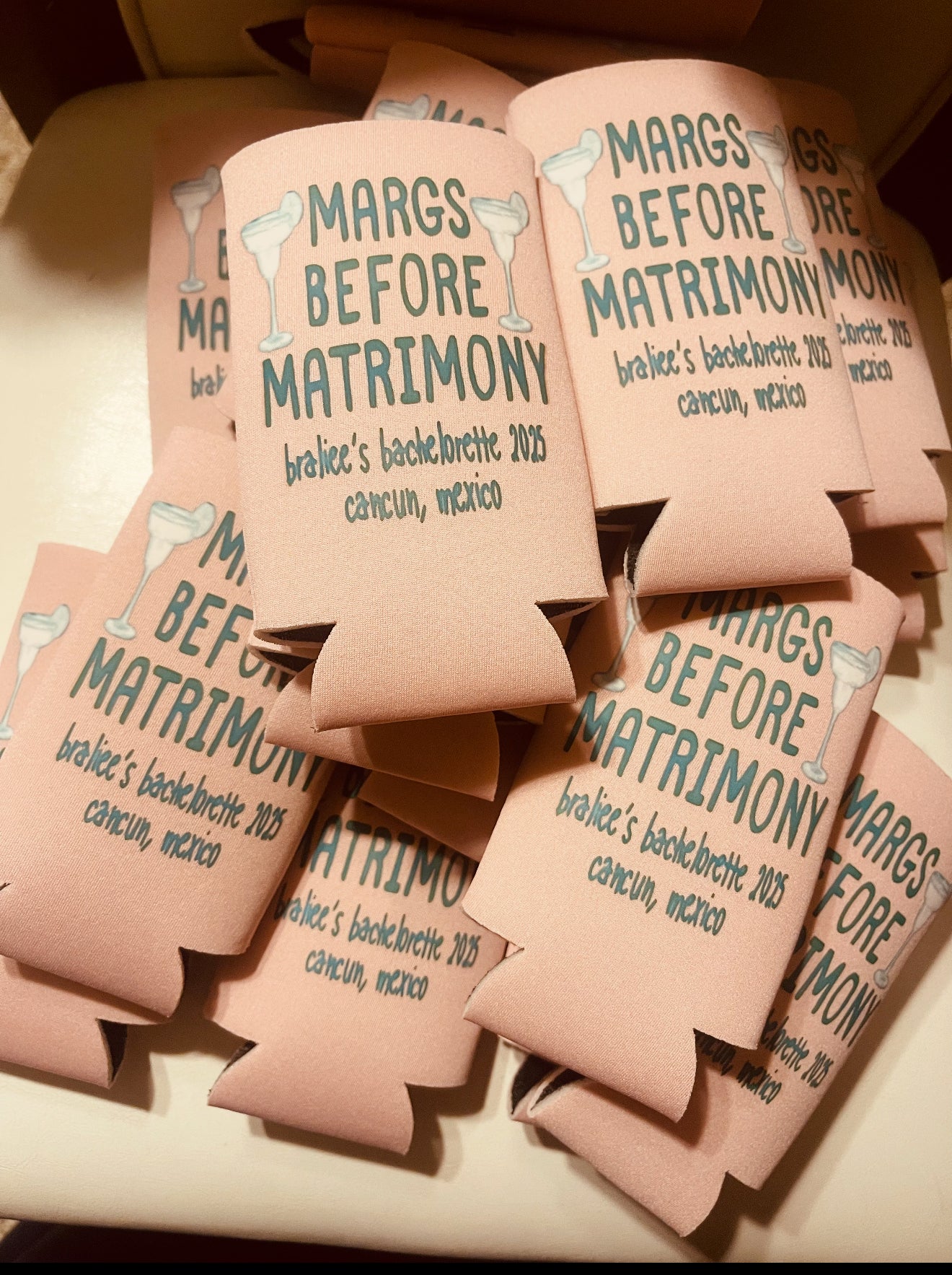 Make any event or celebration stand out with our customizable Koozies! Choose from a variety of colors and designs, and leave us your details in the customization box or send us a message on Facebook with your inspiration. Perfect for bachelor/bachelorette parties, weddings, and more, our Koozies are a must-have for any gathering!