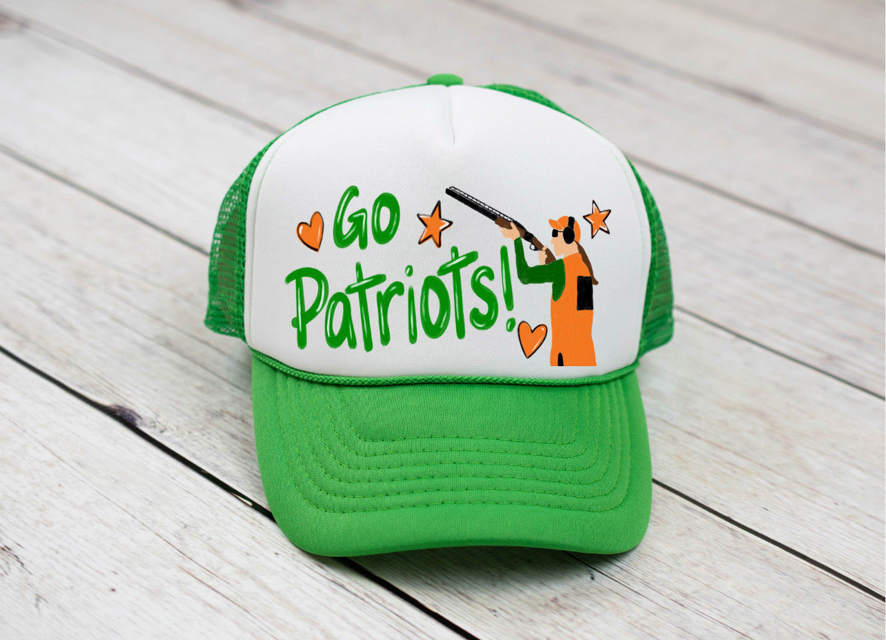 Get ready to show your support for your favorite Rifle Team with this cool trucker hat! Featuring a bold go patriots rifle team design in orange and green, this hat also has a kelly green mesh panel and bill for a unique look. Best of all, it's completely customizable from colors of the hat and design, to the team you are supporting and adjustable for the perfect fit.