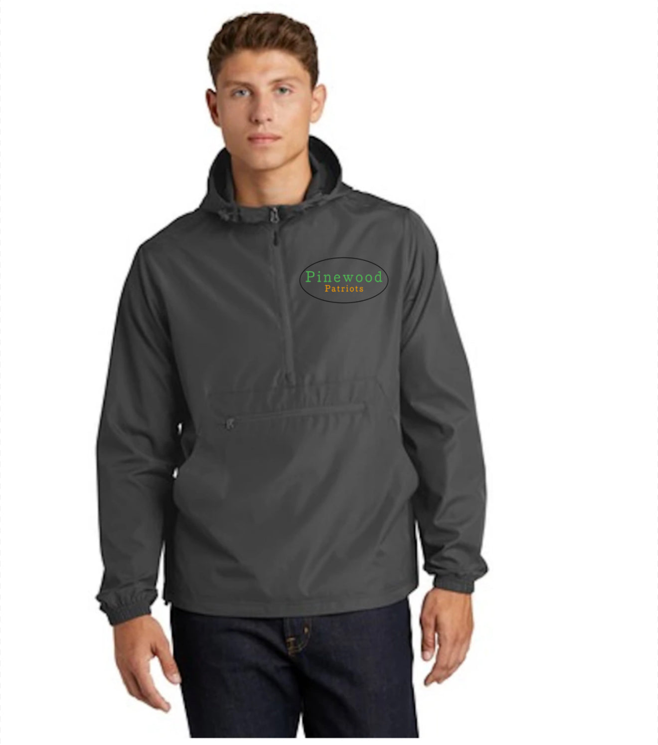 Stay dry and stylish with this playful gray quarter zip rain jacket. Featuring a convenient front zip pouch and cozy hood, it’s perfect for unexpected showers. With handy pockets to stash your essentials, this jacket keeps you covered without cramping your style. Make sure to choose your logo preference in the notes section.