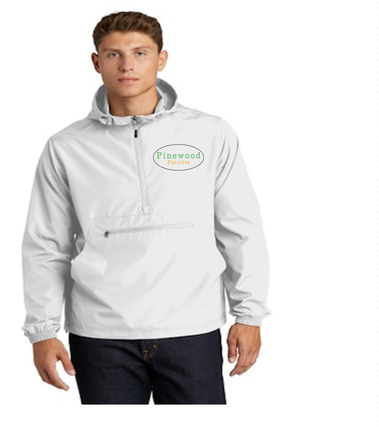 Stay dry and stylish with this lightweight light gray quarter zip rain jacket. Featuring a convenient front zip pouch and cozy hood, it’s perfect for unexpected showers. With handy pockets to stash your essentials, this jacket keeps you covered without cramping your style. Make sure to choose your logo in the notes!